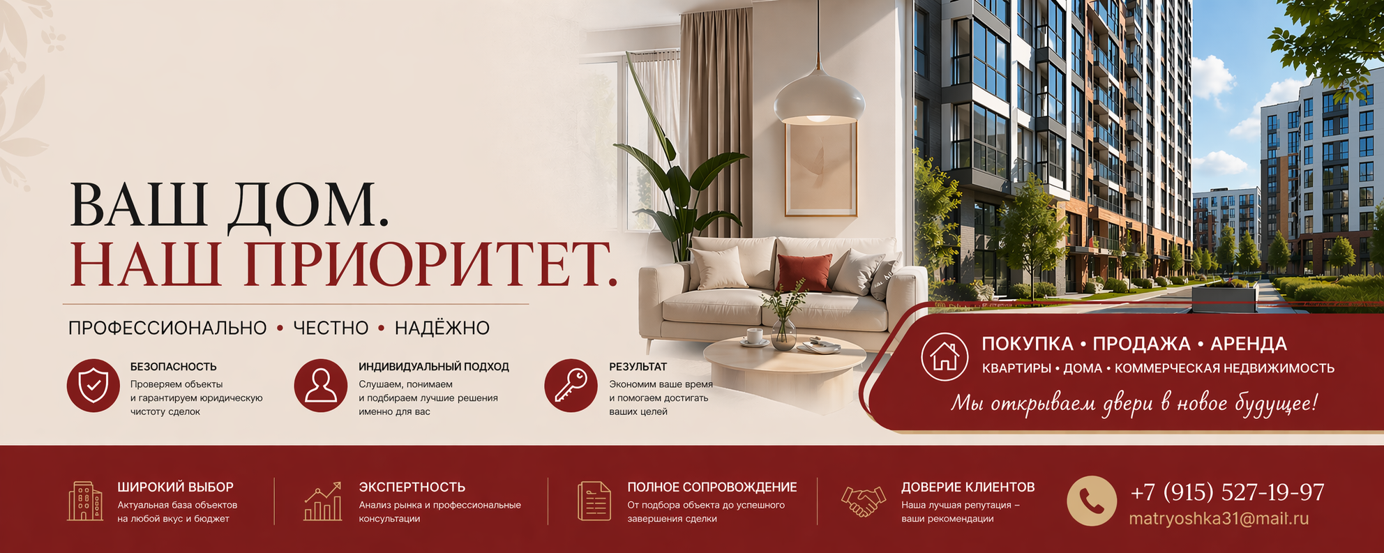Мы создали «Матрешку», чтобы сделать процесс покупки, продажи и аренды недвижимости максимально понятным, безопасным и комфортным. В нашей работе мы ценим честность, внимание к деталям и уважение к каждому клиенту. Независимо от того, ищете ли вы свою первую квартиру, подбираете инвестиционный объект или продаёте недвижимость — мы рядом, чтобы поддержать вас на каждом этапе.