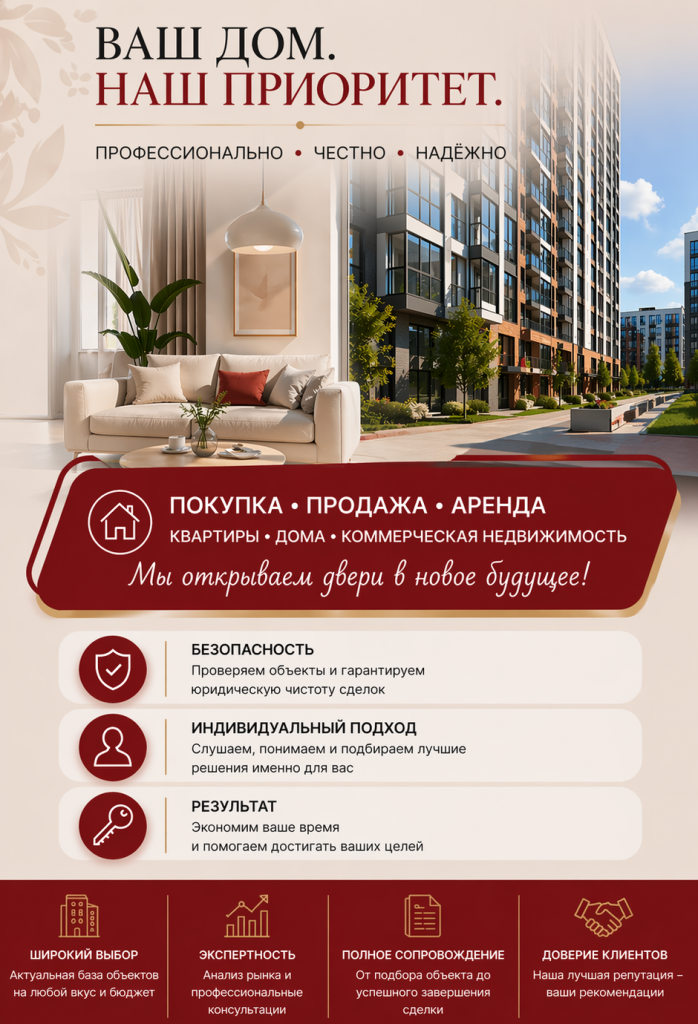 Наша задача — не просто провести сделку с недвижимостью, а сделать её безопасной, выверенной и максимально выгодной для клиента.